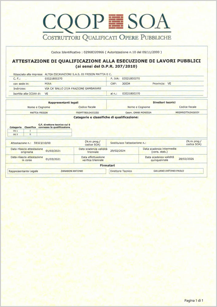 Altea Escavazioni S.A.S.è qualificata per la realizzazione di opere pubbliche grazie all’ottenimento della certificazione SOA.