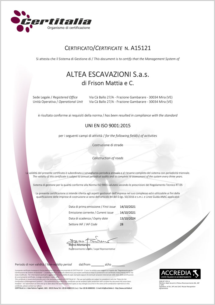 Altea Escavazioni S.A.S. ha ottenuto la certificazione Uni En Iso 9001:2015, che attesta la conformità di tutti i processi dell’azienda.